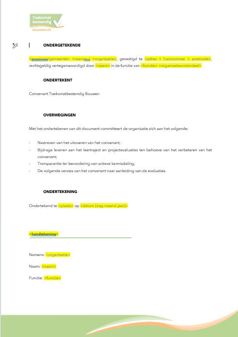 – Na ondertekening wordt het ondertekendocument samen met het organisatielogo gestuurd naar info@toekomstbestendigbouwen.nl. Hiermee wordt de organisatie toegevoegd aan de website als ondertekenaar.