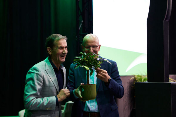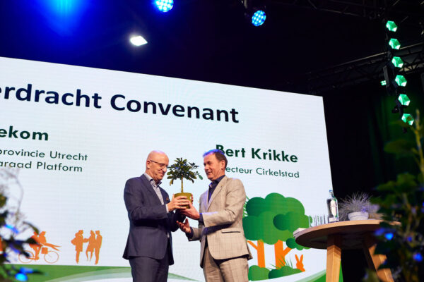 Daarna was het dan toch echt tijd voor de overdracht van het platform en convenant aan Cirkelstad. Initiatiefnemer van het convenant Marrit van der Schaar van de provincie Utrecht schetste kort het ontstaan van dit mooie initiatief en hoe de provincies elkaar vonden. Daarna vond de formele overdracht plaats in de vorm van een boompje dat Rob van Muilekom, voorzitter programmaraad Toekomstbestendig Bouwen en gedeputeerde provincie Utrecht, overhandigde aan Cirkelstad directeur Bert Krikke. Deze verklaarde dat dat zeker goed zou komen vanwege zijn groene vingers. “Ik verzorg alle planten in het Cirkelstadkantoor” lachte hij.