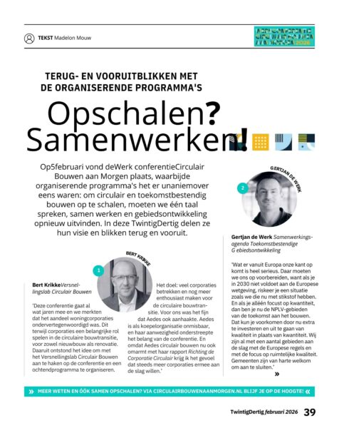 Magazine TwintigDertig was mediapartner van de werkconferentie Circulair Bouwen aan Morgen. In de nieuwste editie blikt de redactie terug en vooruit met de organiserende programma’s. Iedereen was het unaniem eens: Om circulair en toekomstbestendig bouwen op te schalen, moeten we één taal spreken, samenwerken en gebiedsontwikkeling opnieuw uitvinden.