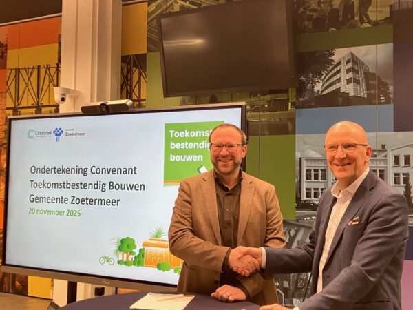 Donderdag 20 november ondertekende wethouder Bouke Velzen (duurzaamheid) namens de gemeente Zoetermeer samen met Bert Krikke, directeur van Cirkelstad het Convenant Toekomstbestendig Bouwen. Dit betekent dat Zoetermeer zich samen met andere gemeenten, bedrijven en organisaties inzet voor duurzaam bouwen.